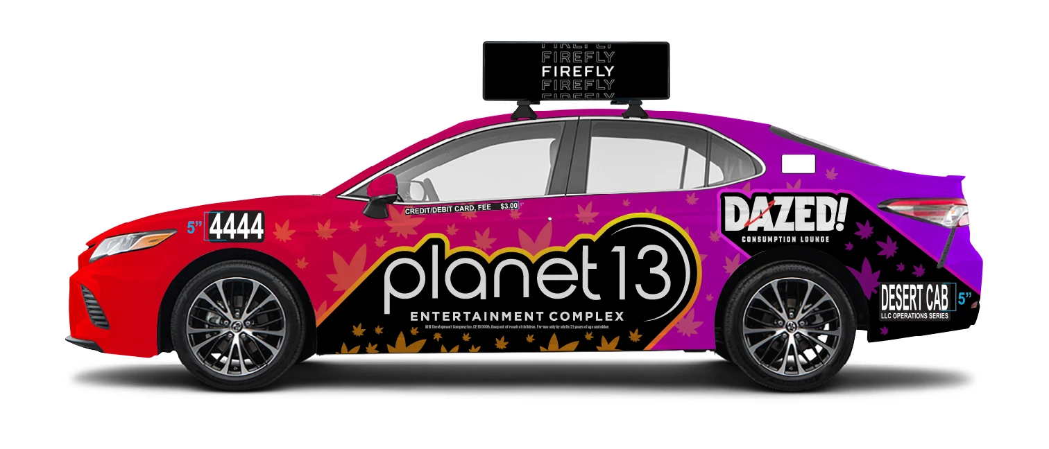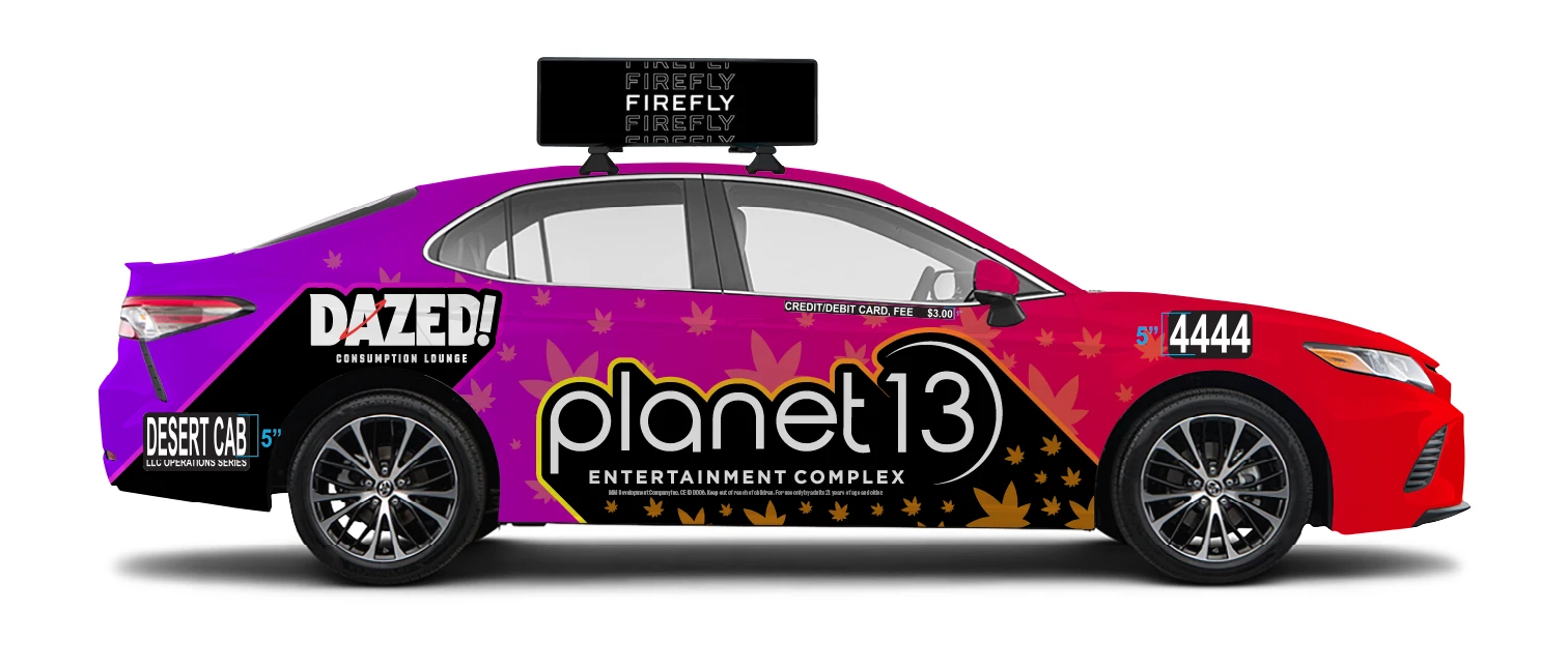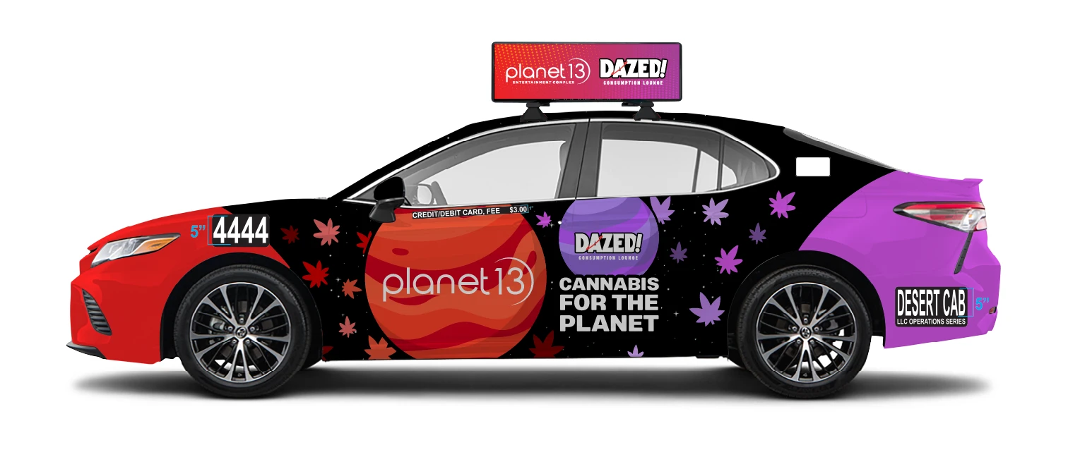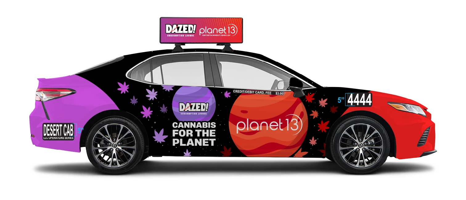 Wrap 1: For the eye-catching cab wrap merging Planet 13 and Dazed Consumption Lounge, I blended Crimson red and galaxy purple into a cosmic backdrop, reminiscent of the vastness of space. Cannabis leaf accents add an extra pop, making sure the ad grabs attention with its colorful, inviting vibe.