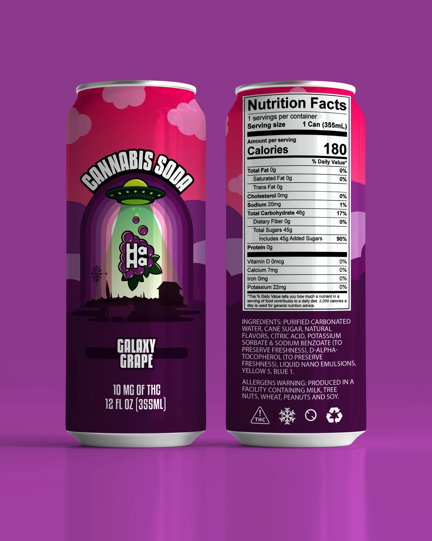 The design journey for Haha's cannabis-infused soda packaging was a creative exploration of their playful and colorful brand identity. Each flavor, from "Mystery Berry" to "Galaxy Grape," now boasts unique and engaging universes, encompassing detective elements, musical excitement, Vegas allure, and intergalactic adventures.